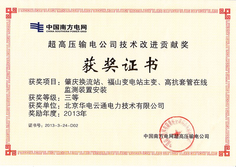 北京華電云通電力技術(shù)有限公司成立于2000年,是一家有20年智能電網(wǎng)在線(xiàn)監測產(chǎn)品及系統解決方案經(jīng)驗的企業(yè)。公司集電力設備狀態(tài)監測系統的設計、開(kāi)發(fā)、生產(chǎn)、服務(wù)、銷(xiāo)售于一體,為電力用戶(hù)提供全套解決方案。經(jīng)過(guò)多年的持續發(fā)展,公司榮膺“國家高新技術(shù)企業(yè)”、“中關(guān)村高新技術(shù)企業(yè)”、“北京市豐臺區專(zhuān)精特新企業(yè)”、“南方電網(wǎng)超高壓輸電公司技術(shù)改進(jìn)貢獻獎”等近百項榮譽(yù)稱(chēng)號。
